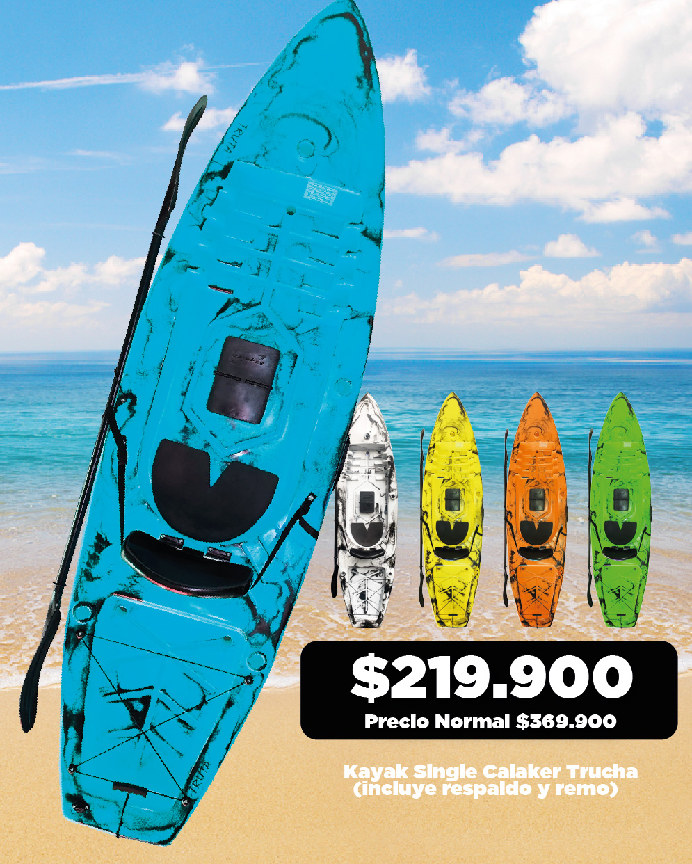 El Trucha es un kayak sit on top con una capacidad de carga de 120 kg, tiene unas medidas de 280 cm de largo y 75 cm de ancho y 45 cm de alto, lo que le proporciona una gran estabilidad y rendimiento en el agua.